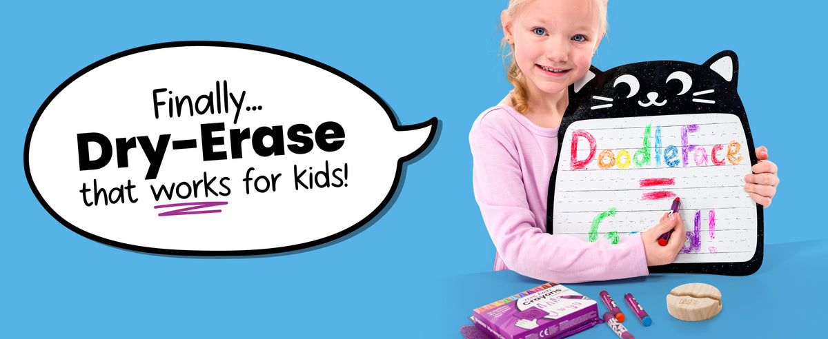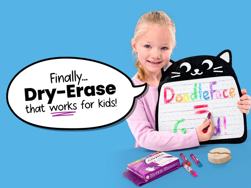 Finally, Dry-Erase That Works for Kids. No more dried-out markers, smudging, or ink-covered hands. DoodleFace Wipe-Away Crayon Lapboards are premium, mess-free, reusable boards that truly last. Loved by teachers, parents, and kids for handwriting, play, art, and learning at home or in the classroom.