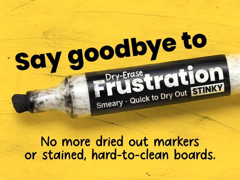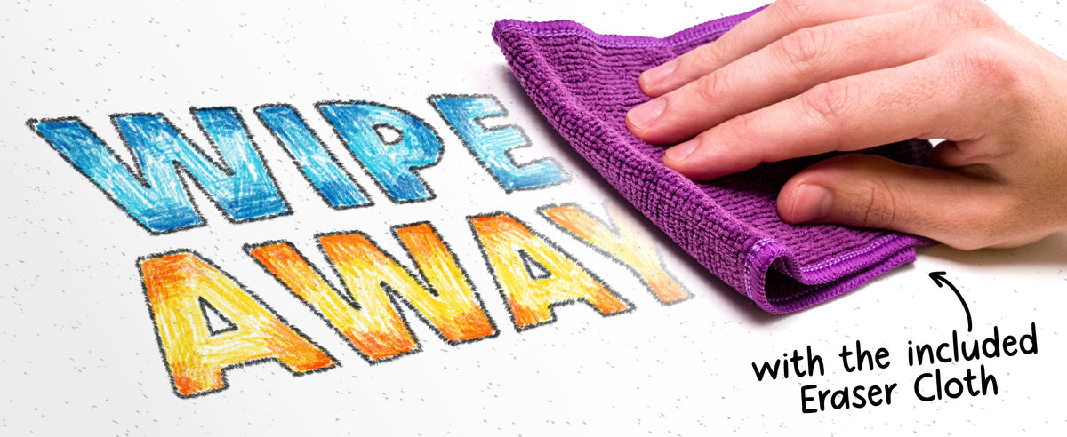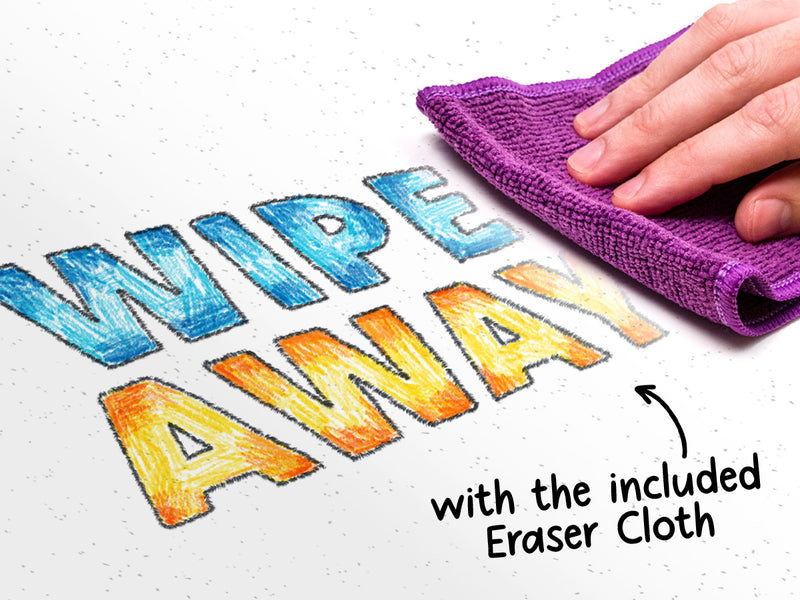 Never Buy Dry Erase Markers Again. Includes 10 jumbo Wipe-Away Crayons that never dry out, leak, or stain like dry-erase markers. No more replacing pens or wasting supplies. Simply wipe clean with the included eraser cloth to start fresh—color, write, wipe away, repeat.