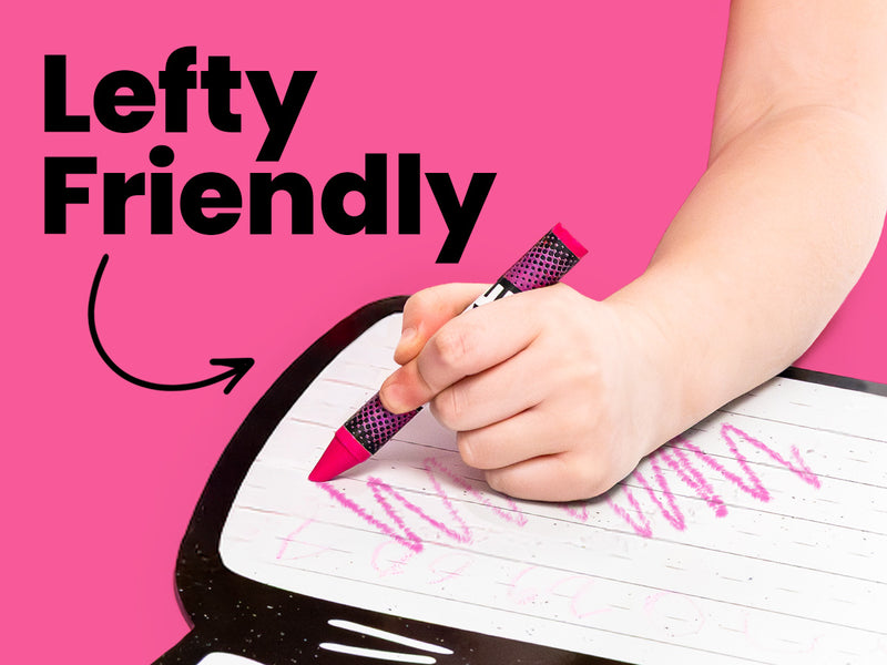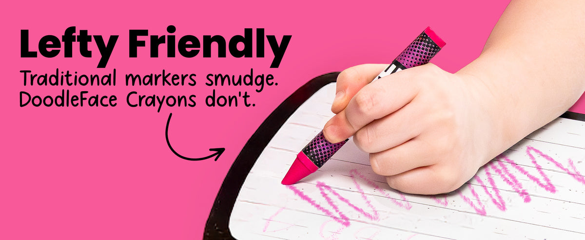 Smudge-Free Writing for Ages 2–8. Left-handed writers rejoice—DoodleFace Crayons don’t smear under your hand like dry-erase ink. Easy-grip jumbo crayons encourage coordination and control while keeping little hands clean. Ideal for handwriting, art, math, and creative play. Adult supervision recommended for children under age 3.