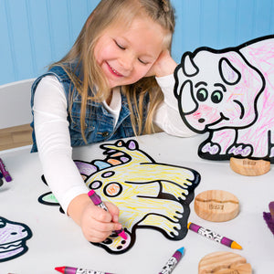 Durable, Sustainable, and Safe. Premium thick materials and solid wooden bases ensure lasting durability, reduced waste, and genuine value. Made from high-quality, child-safe, non-toxic materials for worry-free play. A Montessori-inspired toy that benefits families, classrooms, and the planet. Characters made in the USA; crayons made in China.