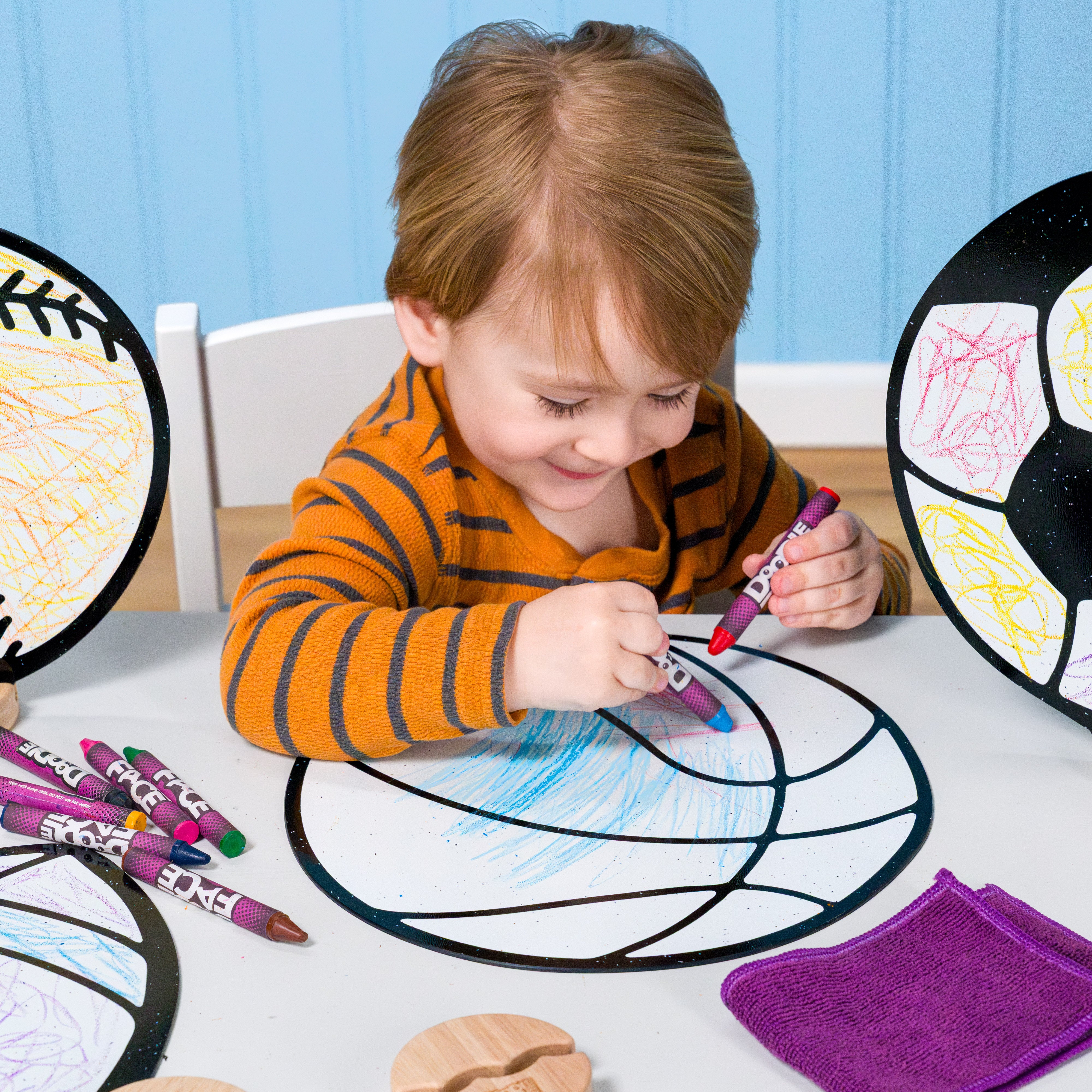 Color, Play, and Wipe Away for Endless Fun. Color with DoodleFace Wipe-Away Crayons. They stay on during play, then magically erase with the included eraser cloth when it is time for a new adventure. Unlike messy dry-erase markers, DoodleFace Crayons never dry out and are perfect for reusable, creative play.