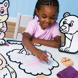 Color, Play, and Wipe Away for Endless Fun. Color with DoodleFace Wipe-Away Crayons. They stay on during play, then magically erase with the included eraser cloth when it is time for a new adventure. Unlike messy dry-erase markers, DoodleFace Crayons never dry out and are perfect for reusable, creative play.